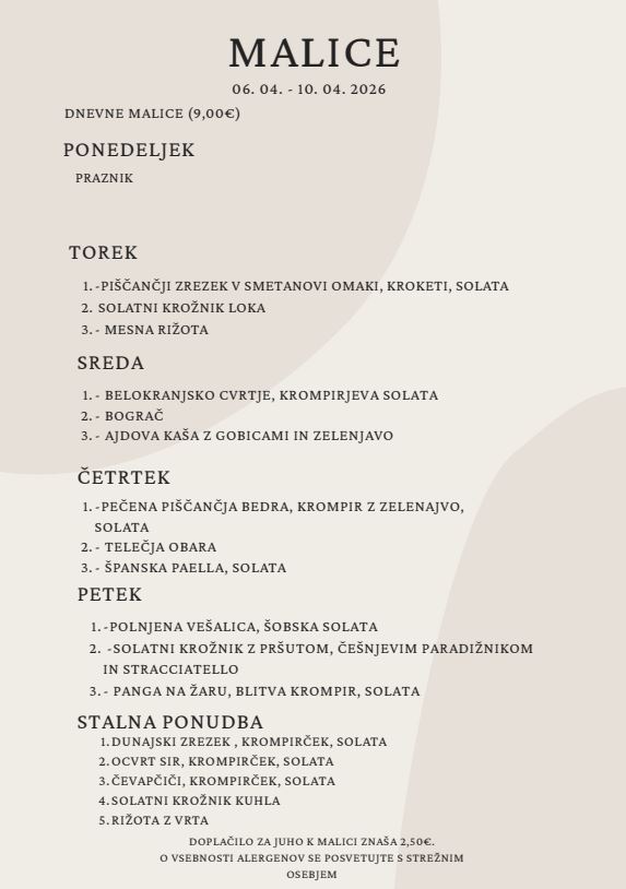 Dnevno sveže pripravljene malice, ki jih naši kuharji, z veseljem do kuhanja, med tednom pripravljajo za vas od 10h do 13h.
